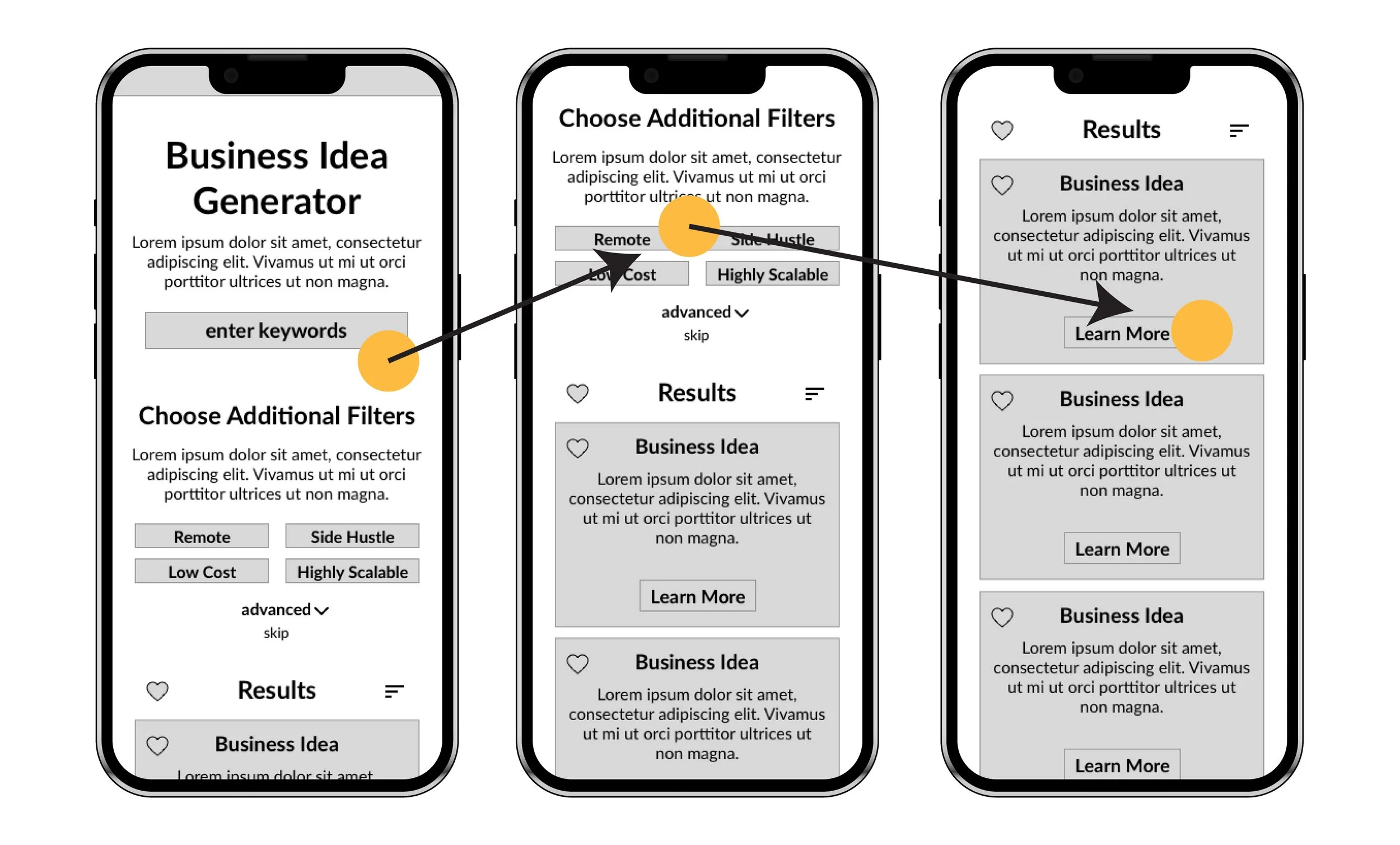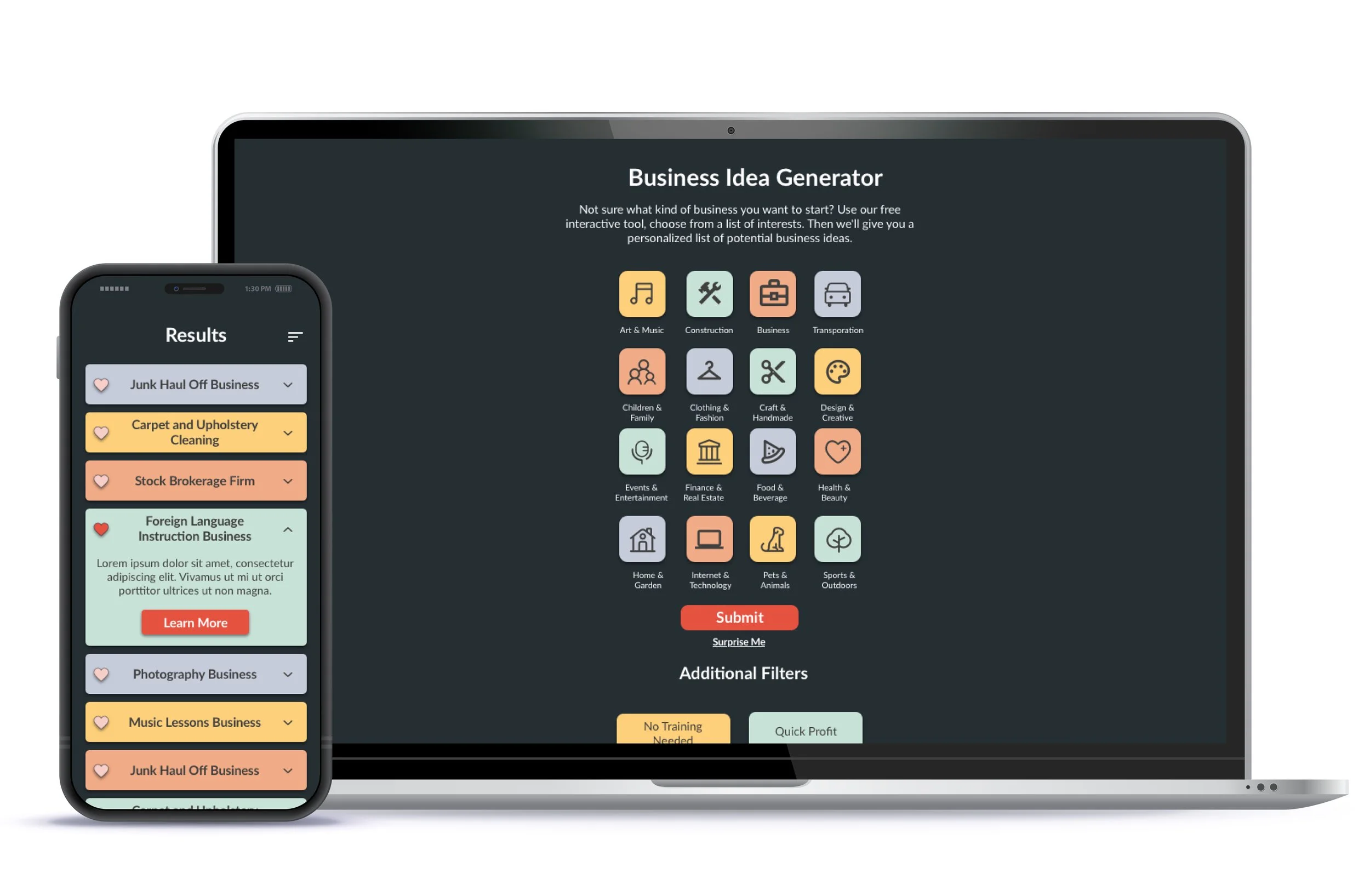 This tool was designed to sort through 800+ business ideas to provide users with a list of appropriate options. How: the user chooses from a list of industries and other criteria to generate their best match. Once they have their results, each card opens up to provide a synopsis of the idea with the option to learn more or “favorite” the idea. The user can compare the ideas based on scalability, capital needed to start, number of employees needed, etc.