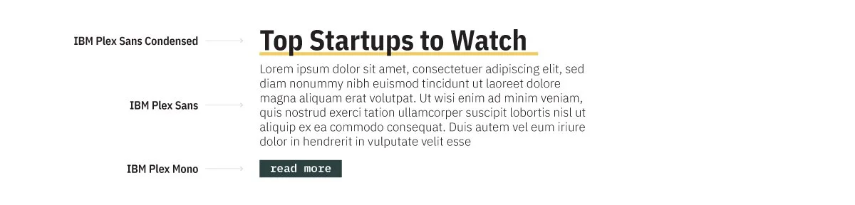 Using the IBM Plex family gave us options to mix and match. IBM Plex Mono became tags and labels, and IBM Plex Sans and IBM Plex Condensed comprised the heading and body fonts.